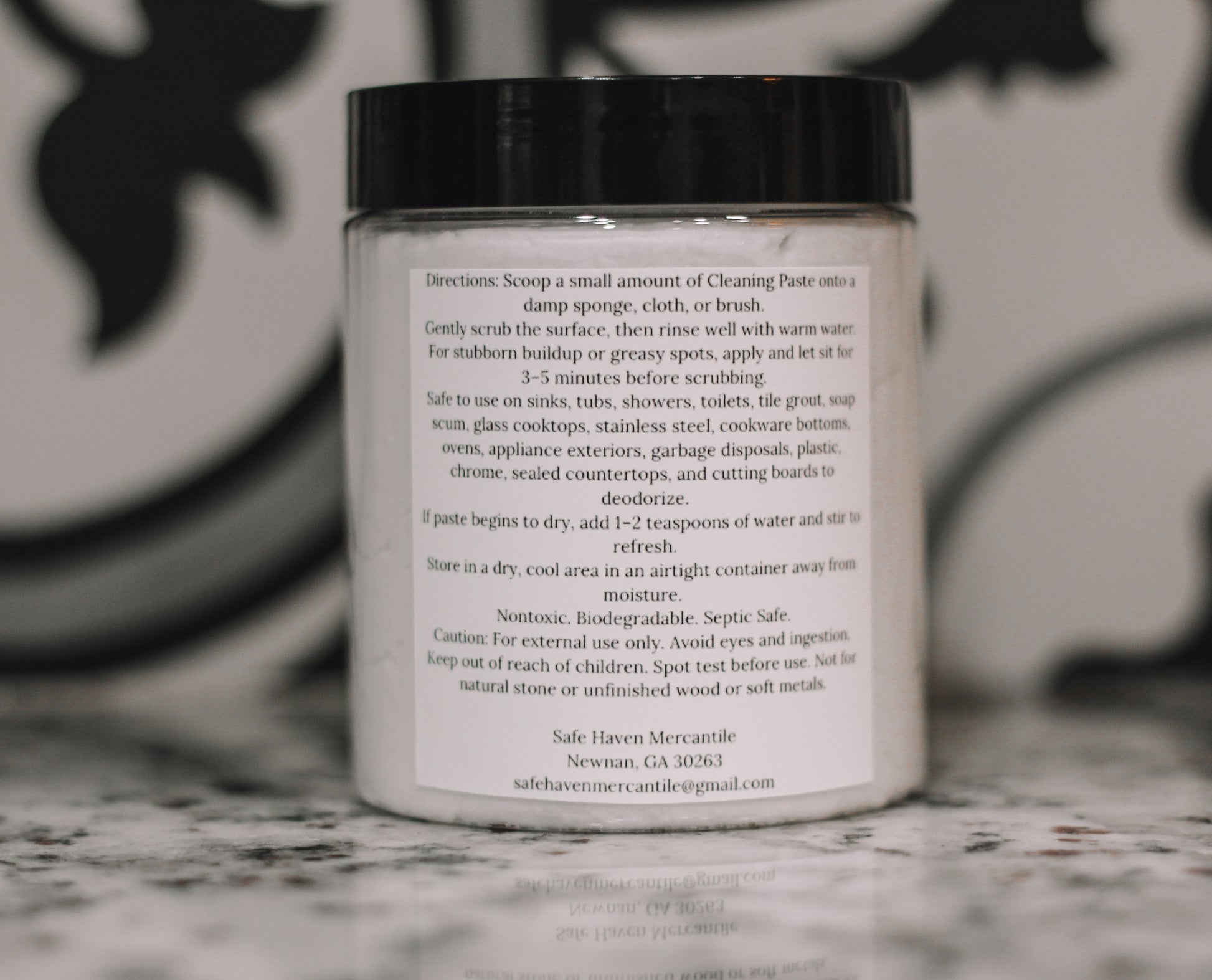 Handmade in small batches at Safe Haven Mercantile, our Cleaning Paste is non toxic, biodegradable, and septic safe, giving you a powerful clean without compromising your home’s health or your family’s wellbeing.